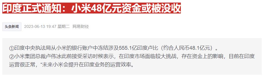 2022 年,印度执法局突然出手,冻结了小米印度 555 亿卢比的资金,折合人民币约 48 亿元。理由是什么?是小米把印度赚的钱,打回总部交专利费去了,印度说这是非法汇款。小米告了几年,至今没解冻,这笔钱,事实上已经被 " 充公 " 了。