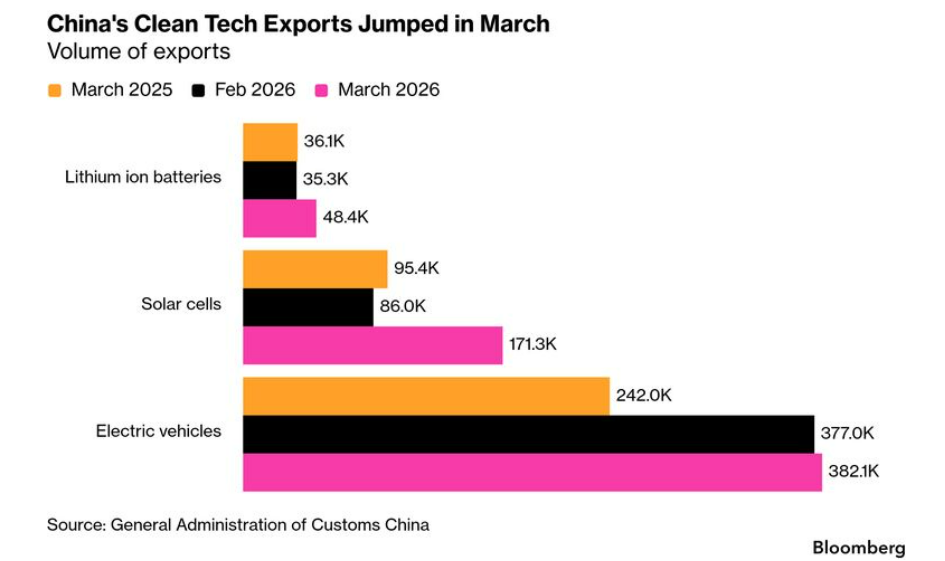 中国3月新能源产品出口大增 图片来源:彭博