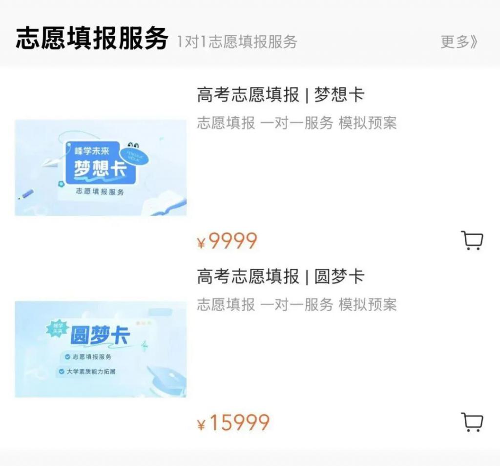 而市面上,一对一的志愿咨询服务价格则不等,初级的服务起步价在 2999 元,高端的咨询服务像峰学蔚来推出的产品价格能达到近 2 万元。