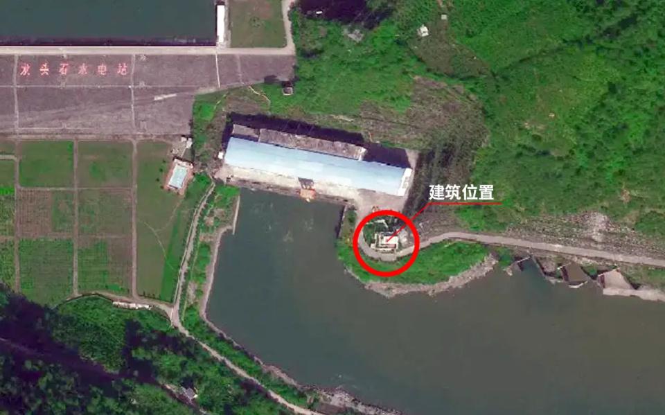 21 日中午,记者抵达龙头石水电站,站在水电站西侧的道路上可清晰看到龙头石水电站全貌,坝体上标注有 " 龙头石水电站 " 字样,大坝下方是发电厂房,而网友所说的建筑就建在发电厂房旁侧。