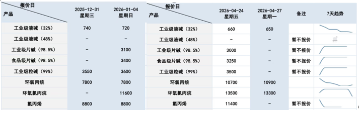 据公开披露数据,滨化股份4月27日的工业级液碱(32%)报价650元/吨,较2025年底的740元跌了12.16%;同时,其4月24日给出的工业级片碱(98.5%)、食品级片碱(98.5%)的售价分别是3000元/吨、3250元/吨,均低于今年1月4日给出的3100元、3400元;此外,公司4月24日的工业级粒(99%)报价是3500元,低于去年年底的3550元。