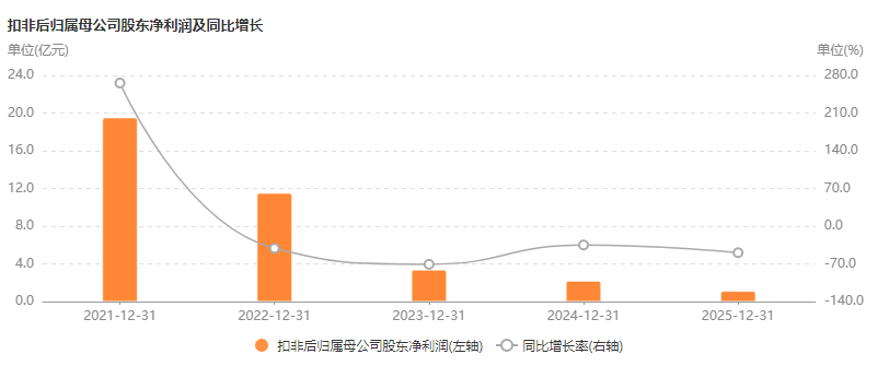 剥离资产处置、政府补助、套期保值等构成的非经常性损益,滨化股份归母净利润已连续下跌四年,2022年至2025年,分别同比下滑41.07%、70.78%、34.96%、49.33%,其中2025年扣非后归母净利润已降至1.11亿元,是近17年的新低,略高于2008年的0.8亿元。