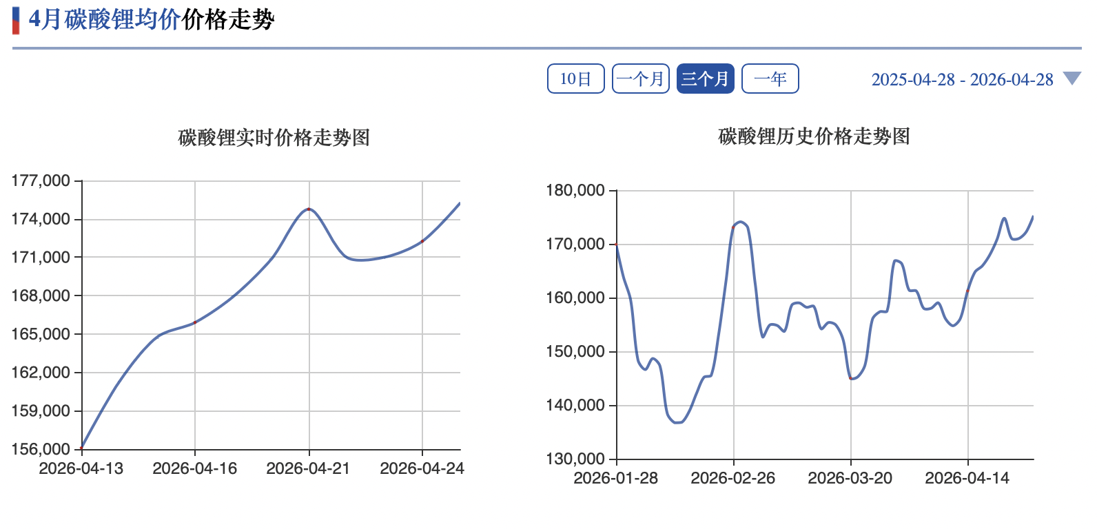 数据显示,2026年以来,锂产品价格大幅上涨。其中,今年1月,碳酸锂从月初‌11.9万元/吨‌ 上涨至月末‌15.25万元/吨‌,涨幅达28.15%;2月延续偏强态势,现货一度突破17万元/吨;3月电池级现货从每吨17万元上方回落至15万元附近进入4月,碳酸锂价格再次回升至17.40万元/吨以上。