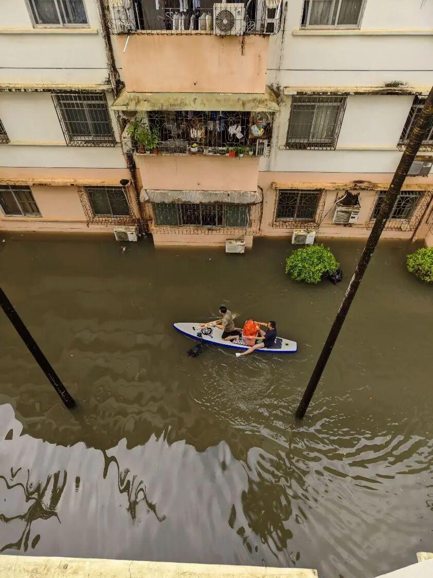 当天中午 12 点左右,雨小了,下午 1 点多,医院派了两个人,开着一艘小艇,载着泡面,一栋楼一栋楼地派发。李淮也在帮忙,他说,每人一桶,够撑一顿。