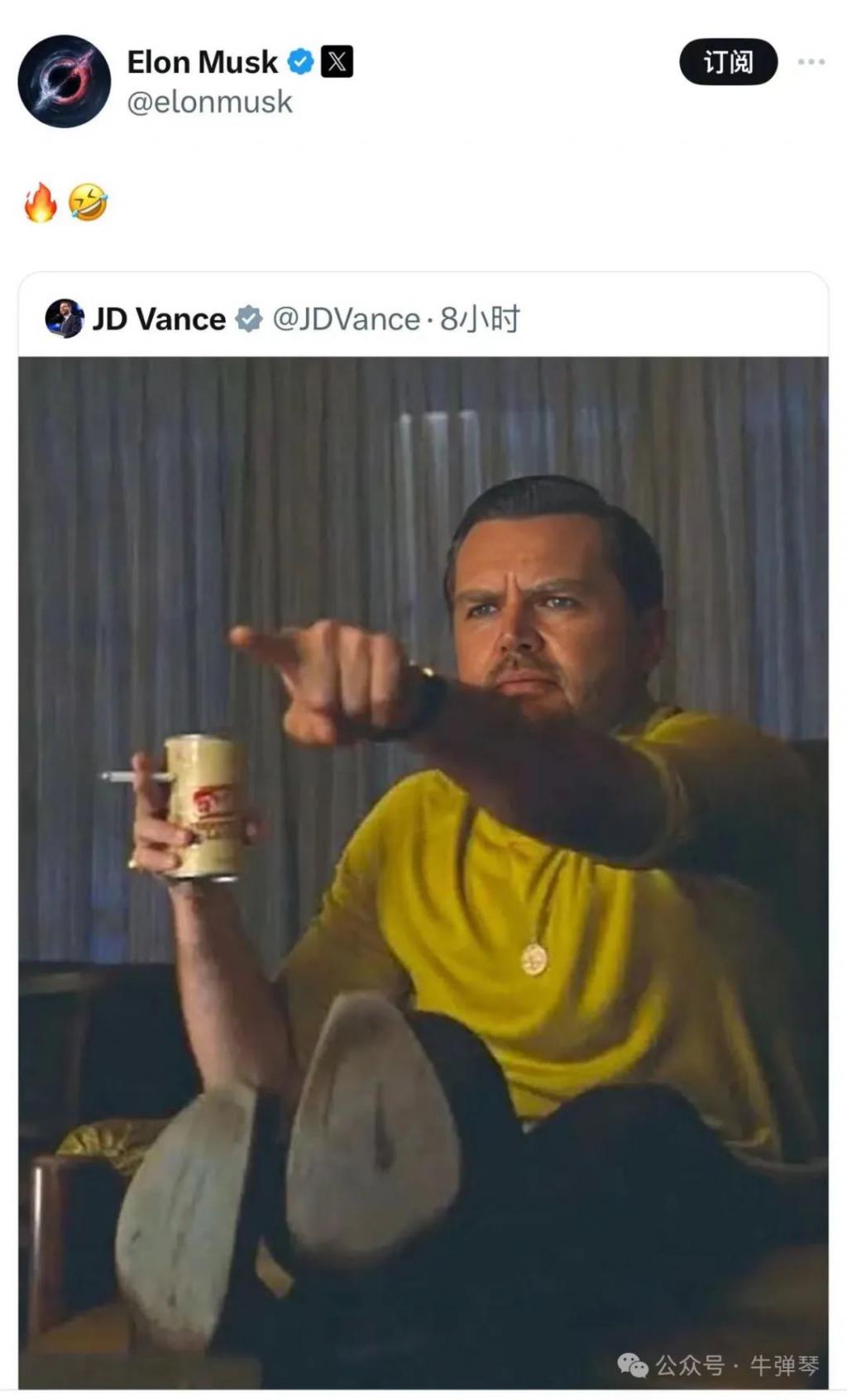 而且,马斯克还转发了一张副总统万斯的图片,万斯抽着烟,很惬意地躺着,手指着前方。