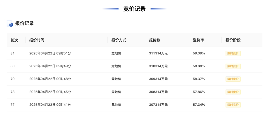 竞价记录显示,地块经过81轮竞价后,由绿城旗下杭州浙咏置业有限公司以总价311314万元竞得,成交楼面价35066元/平方米,溢价率59.39%。