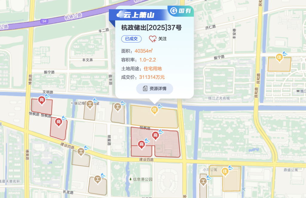 其中,杭政储出[2025]37号即萧山区萧山城区市北单元XS070101-26地块,该地块东至金鸡路,南至恒枫路,西至四甲河绿化带,北至前解放河绿化带。地块出让土地面积为40354平方米,出让建筑面积为88778.8平方米,出让起始价为195314万元,折合起始楼面价2.2万元/平方米。地块用途为住宅(设配套公建)用地。