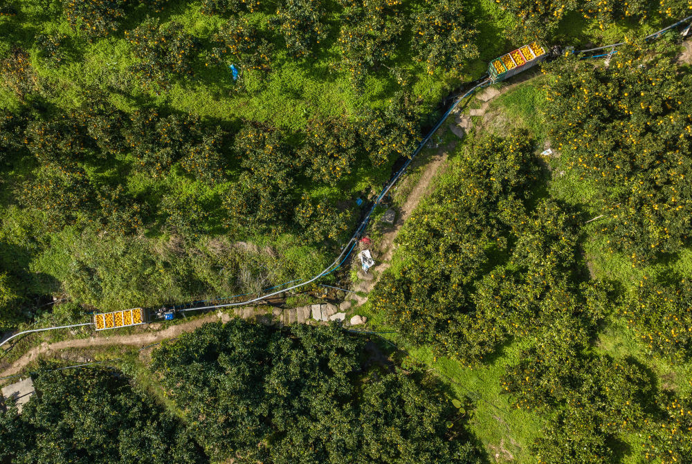 提高脐橙的运输效率,除了无人机,还有其他方式。秭归县鼓励农户在山间建索道、安装单轨或双轨运输车,用于转运脐橙。同时,秭归还引进企业为种植户提供无人机飞手技术培训。