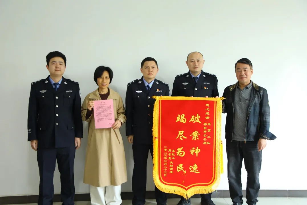 近日,祁阳市公安局经侦大队成功侦破一起涉企合同诈骗案,成功为受害企业追回50万元经济损失。3月24日一大早,受害企业负责人易女士夫妇专程将印有“破案神速、竭尽为民”的锦旗和感谢信送至办案民警手中,为祁阳公安高效履职、护航企业发展的担当作为点赞。
