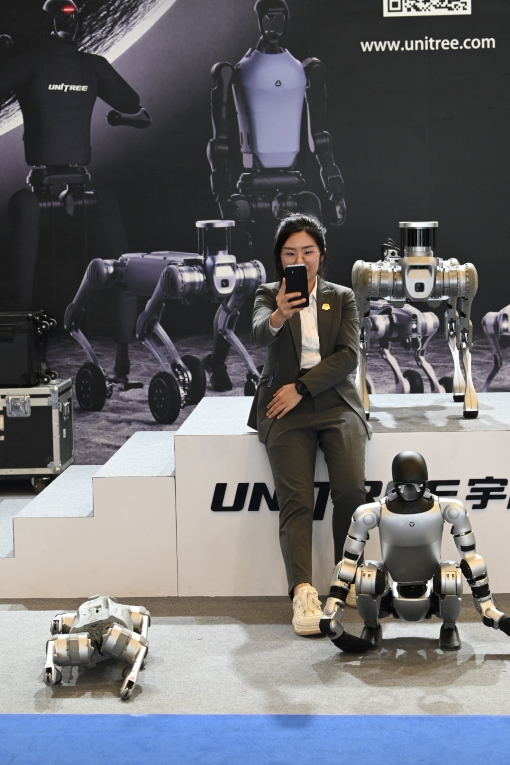 宇树科技展台的三款产品,B2工业四足机器人、G1人形机器人、Go2四足机器狗。