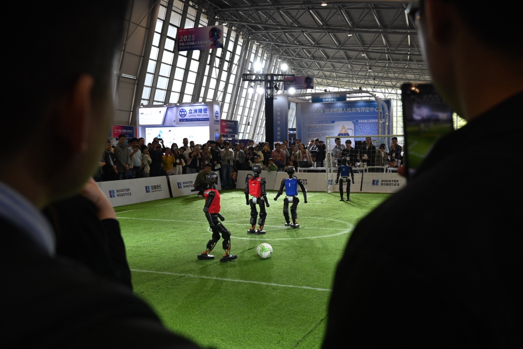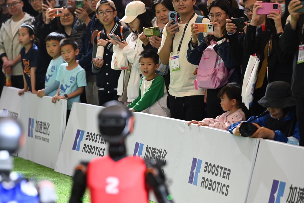 展会中的人形机器人足球表演赛被大批观众围得水泄不通。绿茵场上,机器人分成红、蓝两队。现场观众不仅为机器人的每一次的射门进球而欢呼,也为它们的每一次摔倒或略显哄堂大笑,惊叹声、欢呼声此起彼伏,孩子们兴奋地蹦跳着,家长们纷纷举起手机记录精彩瞬间。