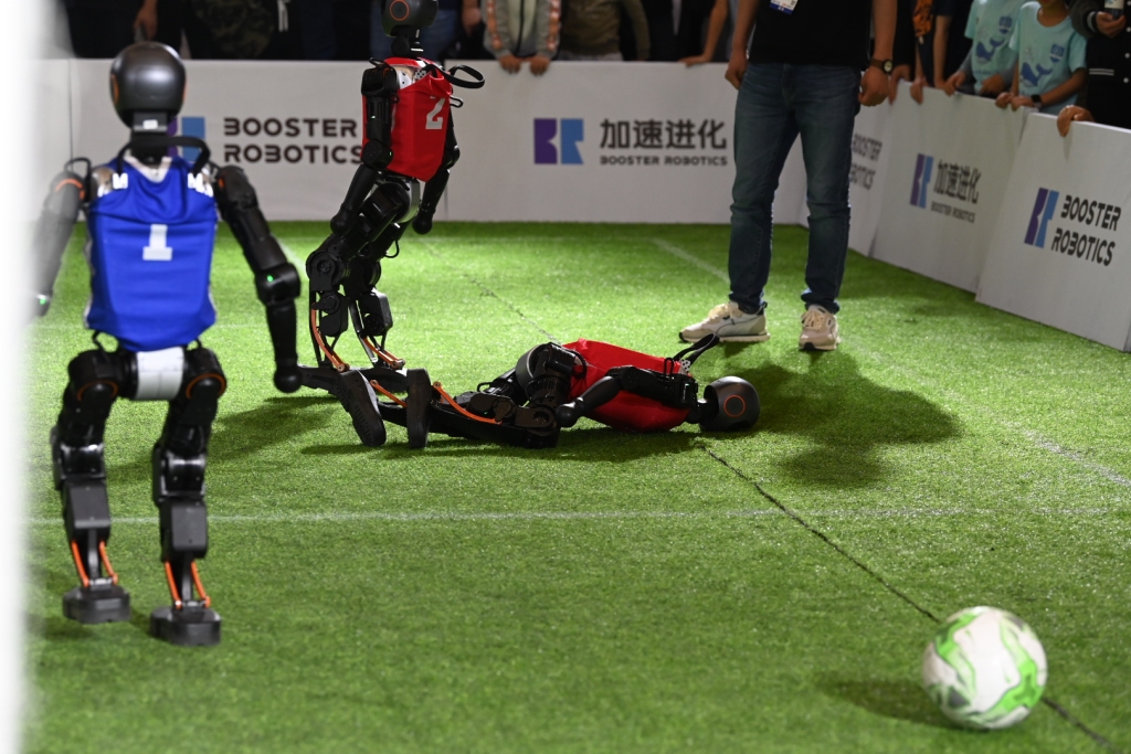 加速进化公司的Booster T1人形机器人在进行足球比赛。