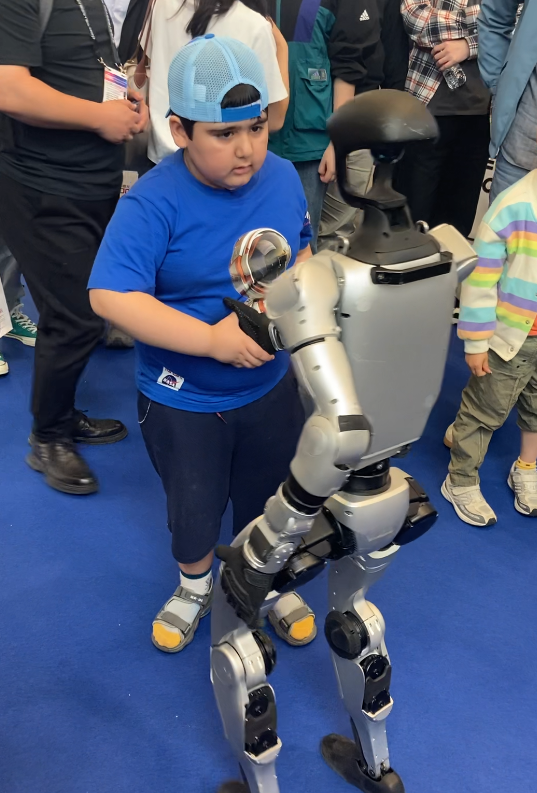 来自伊朗的6岁男孩在爸爸的带领下来到展会,当他首次近距离接触机器人时,对机器人见到人类的反应十分好奇。苏州中学初二年级学生前来开展社会实践,居同学表示,学校有机器人选修课,自己兴趣浓厚,还想看足球赛,郝同学则感慨展会让他开拓了眼界。