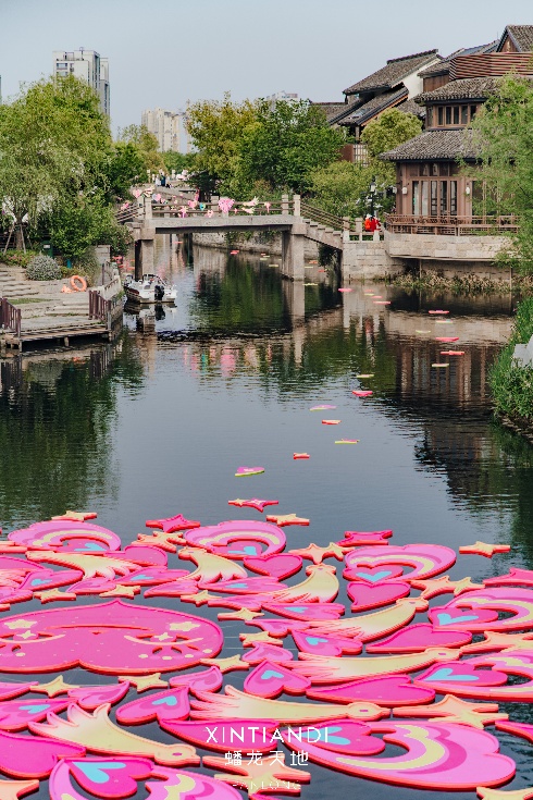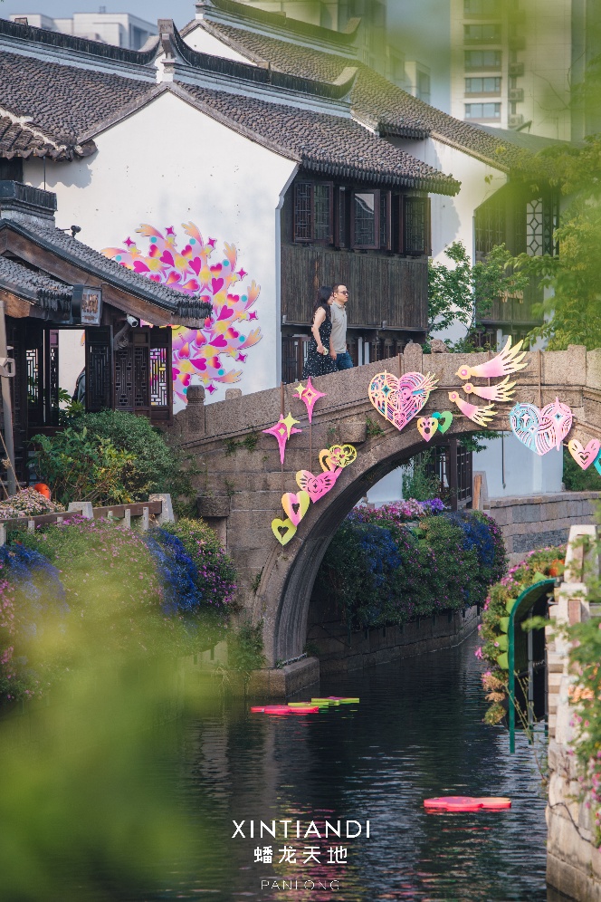 在蟠龙天地的春日,“剪纸”贯穿江南水系与屋舍间,蟠龙湾水面呈现直径13米的巨型水上窗花,佛手、菩提花等江南元素以散点图案轻盈地散落水面;建于元代的香花桥,桥侧剪纸艺术装置蓬勃延展;蟠龙河畔的亭台、游船、建筑,也被“剪纸”包裹,成为诗意空间。