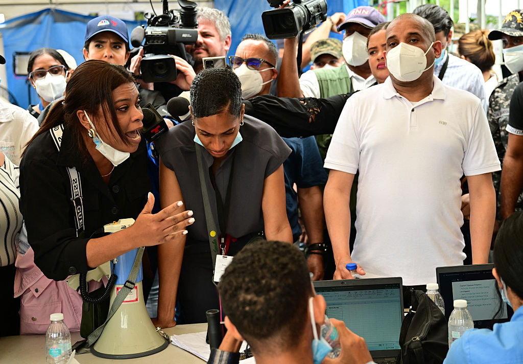 4月11日,圣多明各Jet Set夜总会屋顶倒塌后,一名妇女与法医国家研究所停尸房的工作人员争论,原因是信息延误。马丁·伯内蒂/盖蒂图片社