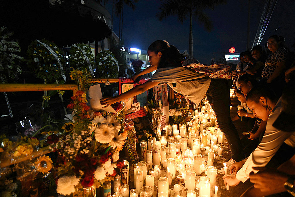 2025年4月12日,朋友和亲戚聚集在圣多明各的Jet Set夜总会外,向本月早些时候大楼屋顶倒塌的遇难者致敬。艾迪·维蒂尼/盖蒂图片社