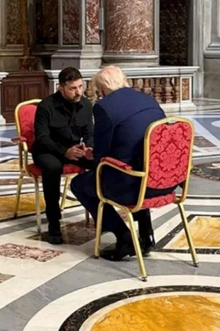 乌克兰总统发布的照片显示,两位领导人在没有助手的情况下,在梵蒂冈华丽的圣彼得大教堂(St. Peter’s Basilica)里进行了密切的讨论。在当地时间今天上午10点(英国夏令时上午9点)葬礼开始前,这对夫妇坐在距离教皇遗体安放地几米远的地方。
