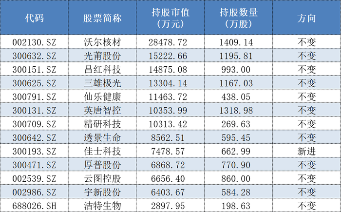 此外,“高毅邻山1号远望1号”还在今年一季度加仓了1300万股的安琪酵母(600298.SH),期末持仓该股的数量上升至3150万股,参考市值为10.88亿元;新进出现在国瓷材料(300285.SZ)前十大流通股东之中,持仓数量为3000万股,期末参考市值为5.59亿元;持仓瑞丰新材(300910.SZ)的数量与去年年报持平,均为1300万股,最新期末参考市值为7.44亿元。