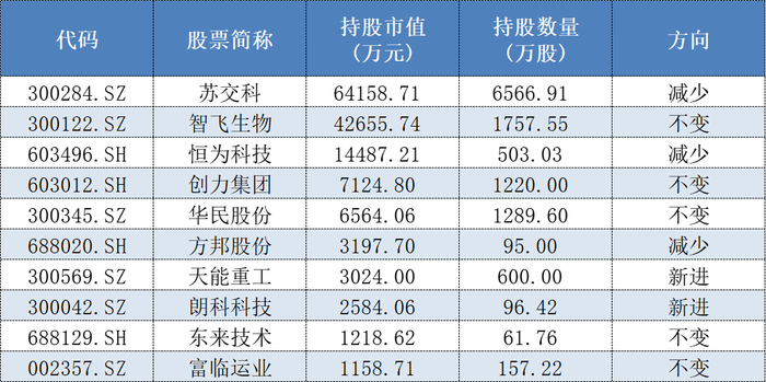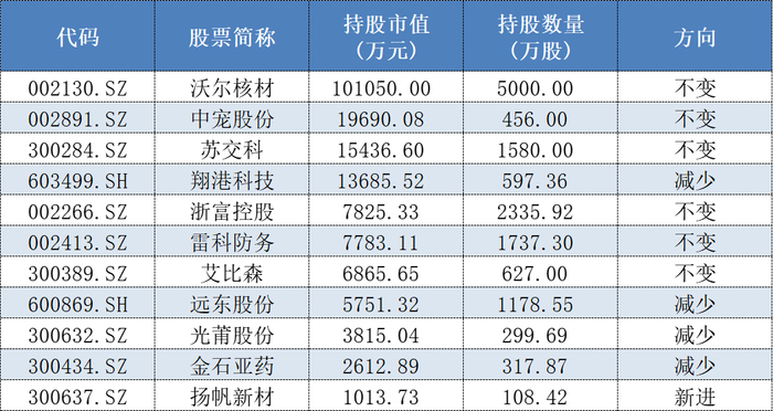 新进方面,迎水投资今年一季度买进了天能重工(300569.SZ)和朗科科技(300042.SZ)前十大流通股东中,期末持仓参考市值分别为3024万元和2584.06万元。
