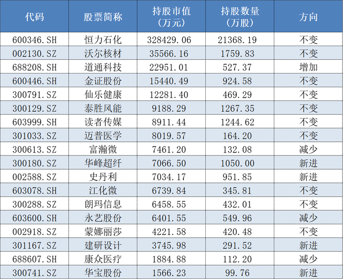 与去年年报时相比,对于一季度末持仓市值超过1亿元五只重仓股,玄元投资有4只持仓数量保持不变,仅道通科技(688208.SH)持仓数量微增115股,其中恒力石化(600346.SH)仍为公司第一大重仓股,期末持仓参考市值高达32.84亿元。