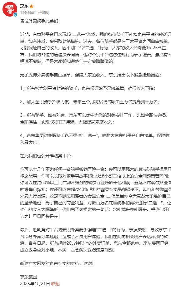 京东在声明中指责竞对平台长期存在 " 不为骑手缴纳五险一金 "" 算法压榨 "" 忽视骑手安全问题 " 等行为,并称其 " 二选一 " 政策损害骑手利益。此外,京东表示,由于近期订单派送延迟,即日起所有超时 20 分钟以上的外卖订单将免单,并已成立专项小组解决配送效率问题。