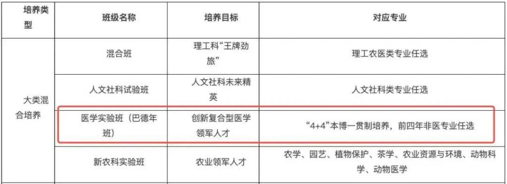 如浙江大学医学院从 2005 年起创办的「巴德年医学班」,前 4 年攻读非医学本科专业,后 4 年进入医学博士培养阶段。