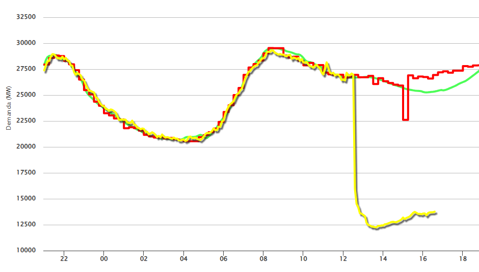 Red Electrica的数据显示,周一中午过后,西班牙电网负荷突然呈自由落体式下降,骤降超过1000万千瓦。