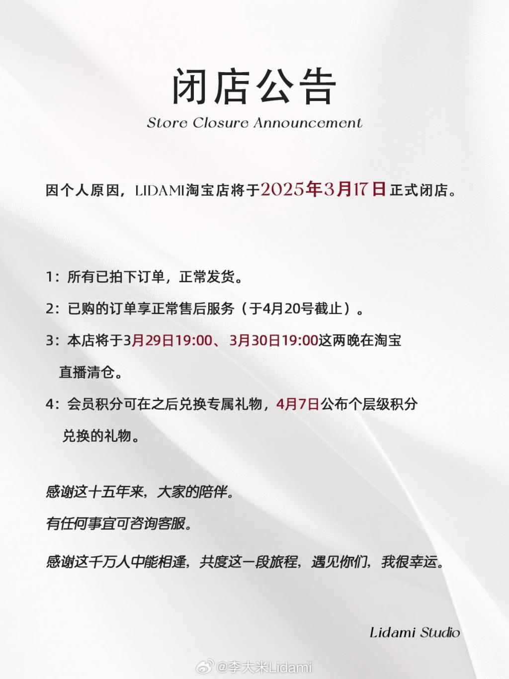 仅仅在 " 仅退款 " 全面退潮的一个月前,拥有 190 万微博粉丝的网红达人 " 李大米 Lidami" 发表了一封 " 暂别信 ",宣布关闭已经营 5552 天的淘宝女装店。
