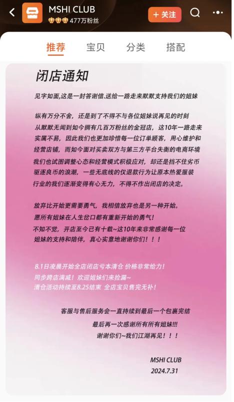 此外," 卤卤 lulu"、" 复古大爆炸 "、" 苏菜萝卜 Studio" 等粉丝超百万的淘宝金冠女装店铺也均在 2024 年宣布闭店或停止上新。