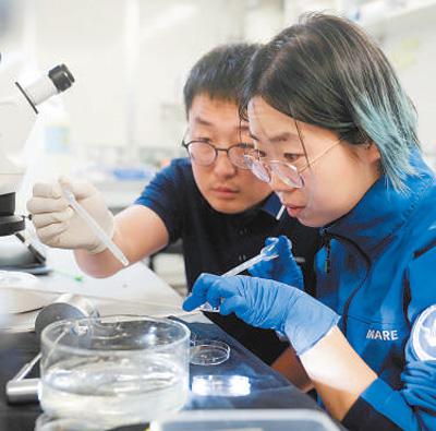 " 雪龙 2" 号科考船上,考察队员迟旭朋(左)和武佳星在船载实验室对南极浮游生物进行分样。
