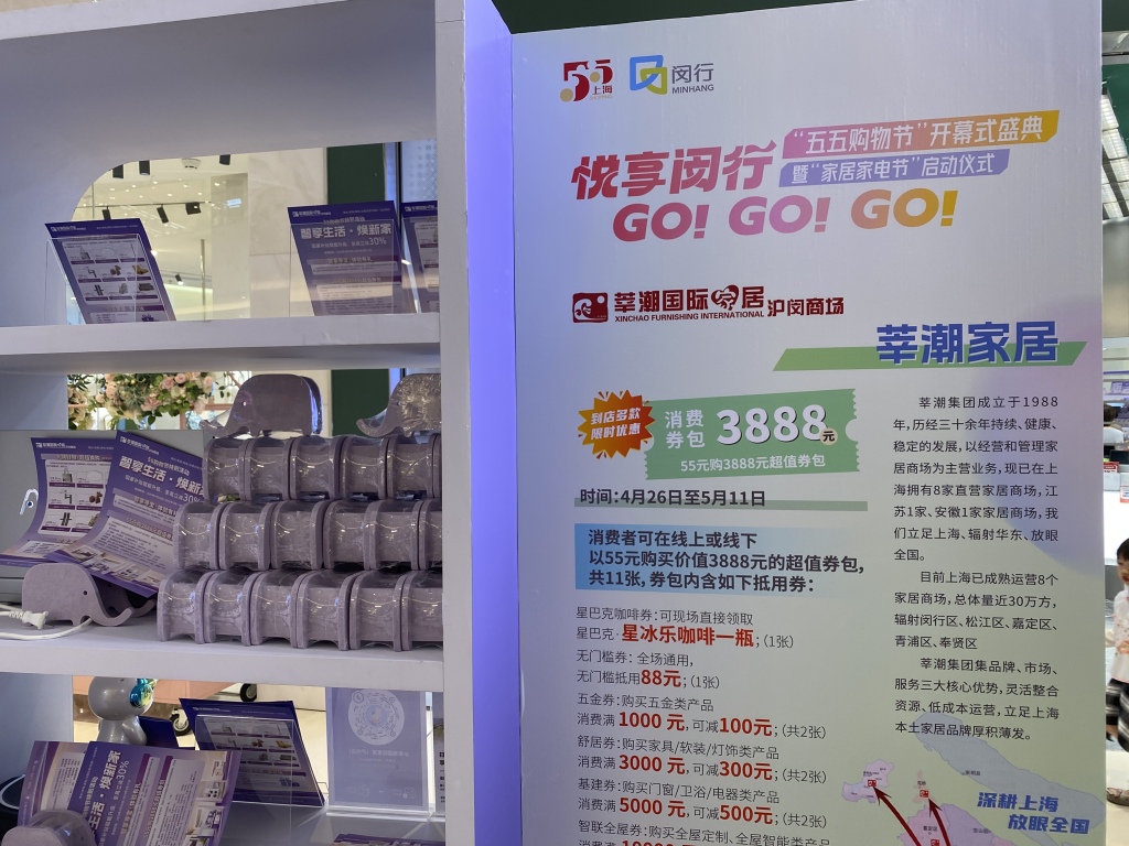 4月29日,以“悦享闵行·GO!GO!GO!”为主题的上海市闵行区“五五购物节”开幕盛典暨“家居家电节”启动仪式在万象城商圈启幕,并推出各种优惠促销。澎湃新闻记者 俞凯 摄