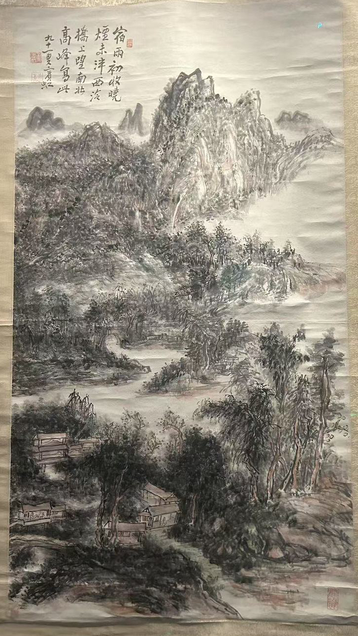 1932年黄宾虹入蜀写生,正值早春天气,他去青城山游览,突遇大雨倾盆。就在此时,他突然看到对面的崖壁,悬挂着许多条飞瀑。尽管雨下得大,老人仍选了块平整的岩石,坐着欣赏起来,此时风声、雨声、水声、松声在他周围交作。老人一边注视着千尺流泉,一边得意地吟诗一首:“泼墨山前远近峰,朱家难点万千重。青城坐雨乾坤大,入蜀方知画意浓。”那时,他好像泡在水池里,不但带去的写生本浇透了,连带去的干粮也变成了“粉糊”。老人觉得。世间好像只有他享受着这名山奇妙的雨景。次日清晨,他骗朋友身体不适,实则“蒙被假寐打腹稿”,想把雨中所见,细细体会,然后从中找出画法规律。躺了半日,奋然披衣而起,磨墨展纸,一气呵成“青城烟雨图”十余幅。有的用泼墨,有的用焦墨,也有用干皴而加彩墨。后来他在“题画嘉陵山水”中把这些体会加以总结,写道:“我从何处得粉本,雨淋墙头日移壁”。关于这个“雨淋墙头”,他曾在一封信中加以说明:“青城大雨滂沱,坐山中三移时。千条飞泉令我恍悟,若雨淋墙头,干而润,润而见骨,墨不碍色,色不碍墨也。”可知他是从大自然中吸取笔墨颜色变化的。