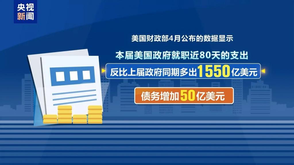 美国财政部 4 月公布的数据显示,本届美国政府就职近 80 天的支出反比上届政府同期多出 1550 亿美元,债务增加 50 亿美元。
