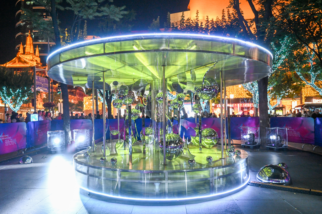 2025年4月29日,上海静安公园,《镜岛》艺术家联名装置作品。由艺术团队MARTIN GOYA BUSINESS创意策划,联合艺术家姚浩澜Top30、尤曜铭Kanes为“闪亮·静安 光影购物SHOW”独家打造国际化光影艺术装置,以常见的旋转木马为制动灵感,改造工业材料与现成品,结合灯光编程,实现日夜有别的视觉光感,打破传统雕塑的单一形态,让一座流光溢彩的神秘岛屿空降静安公园。澎湃新闻记者 朱伟辉 图