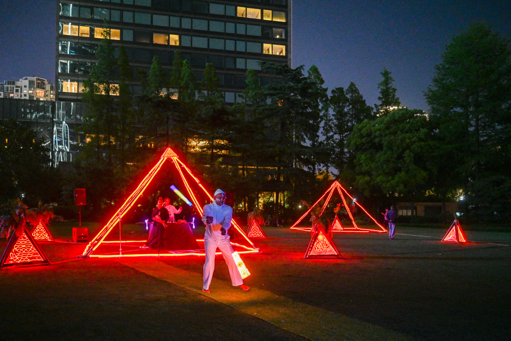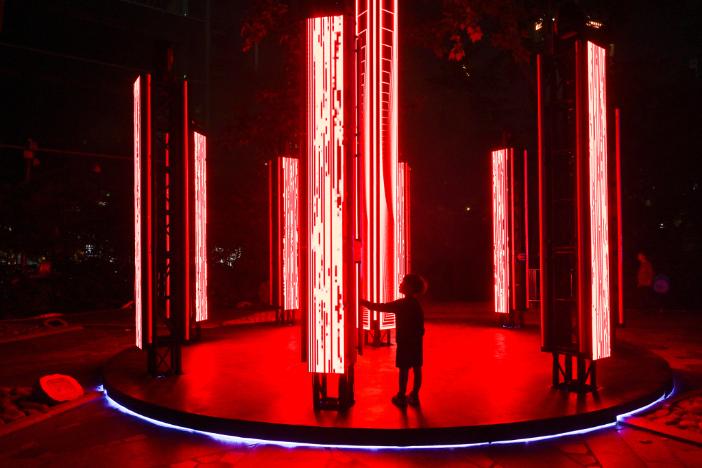 2025年4月29日,上海静安公园,《通感之林》艺术家联名艺术装置&灯光表演。澎湃新闻记者 朱伟辉 图