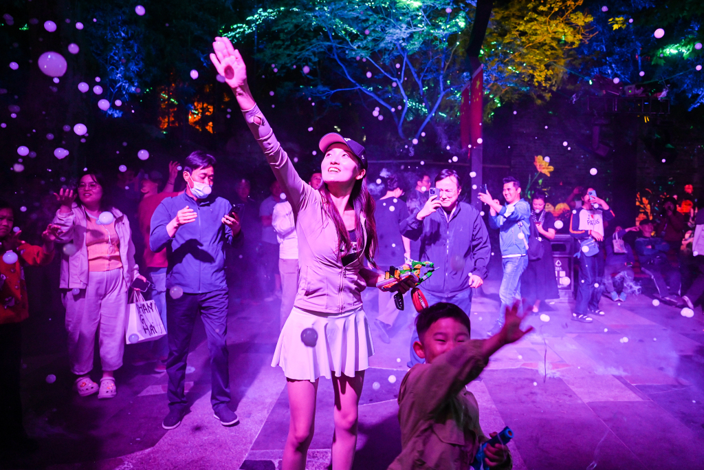 2025年4月29日,上海静安公园,《星光泡泡机》光影装置的泡泡吸引众多游客。澎湃新闻记者 朱伟辉 图
