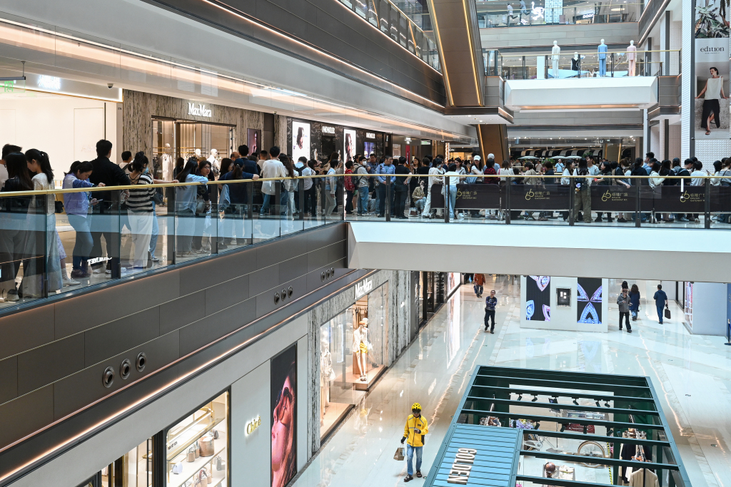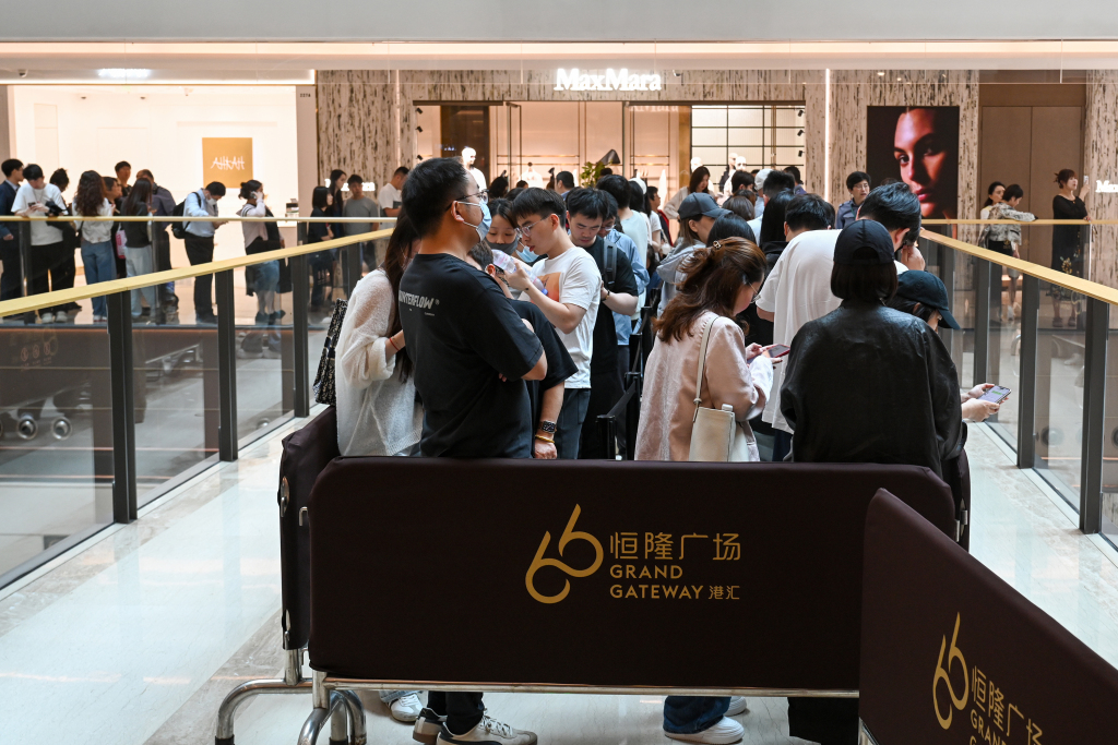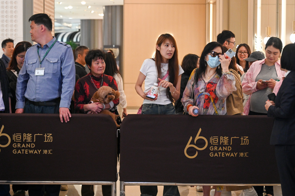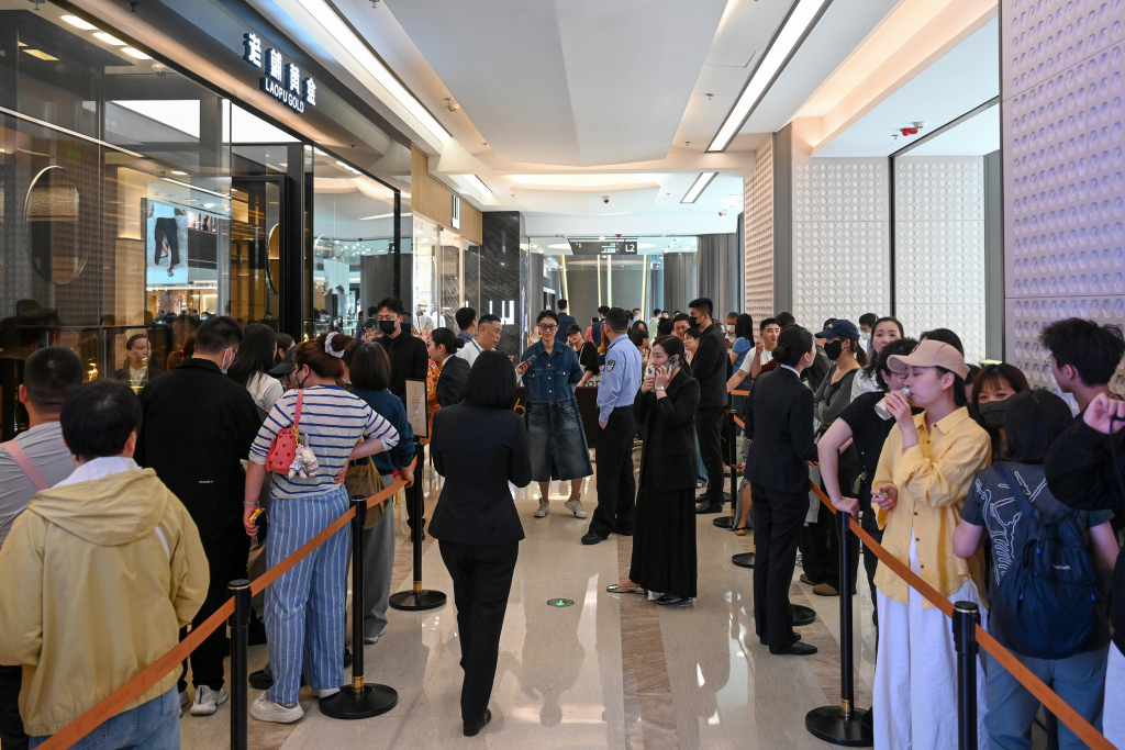 2025年5月1日,老铺黄金上海港汇恒隆广场店正式开市,店门口排队等候的顾客。澎湃新闻记者 朱伟辉 图