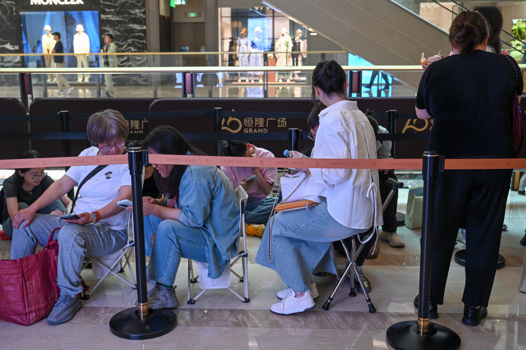 2025年5月1日,老铺黄金上海港汇恒隆广场店,不少顾客自带板凳,坐着等候进店。澎湃新闻记者 朱伟辉 图