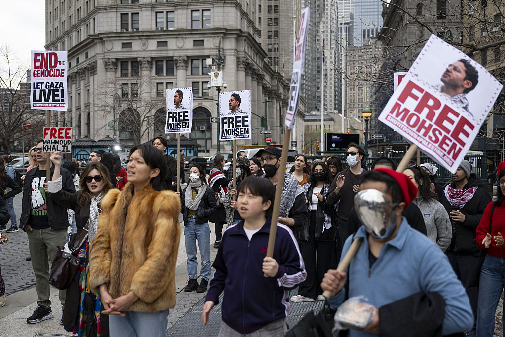 人们参加抗议活动,要求释放巴勒斯坦活动家和哥伦比亚大学学生Mohsen Mahdawi。穆斯塔法·巴西姆/盖蒂图片社