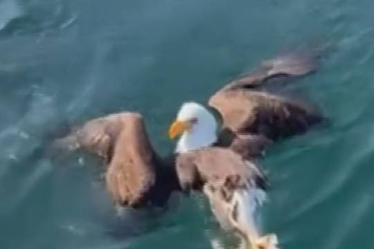 老鹰试图从船夫那里偷鱼