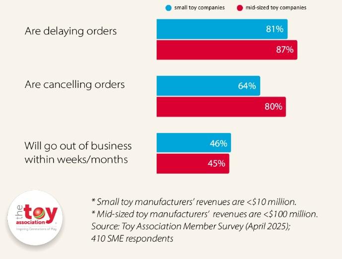 美国玩具协会近期对 400 多家企业的调查显示,超过 80% 的受访企业因关税影响,正在推迟或取消订单;近五成受访企业认为,关税政策将导致它们在数月内破产。