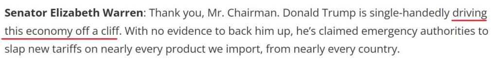 美国参议院银行委员会成员、民主党参议员伊丽莎白 · 沃伦称,所有经济方面的迹象都显示红色警报,美国政府的关税政策正在把美国经济 " 推下悬崖 "。