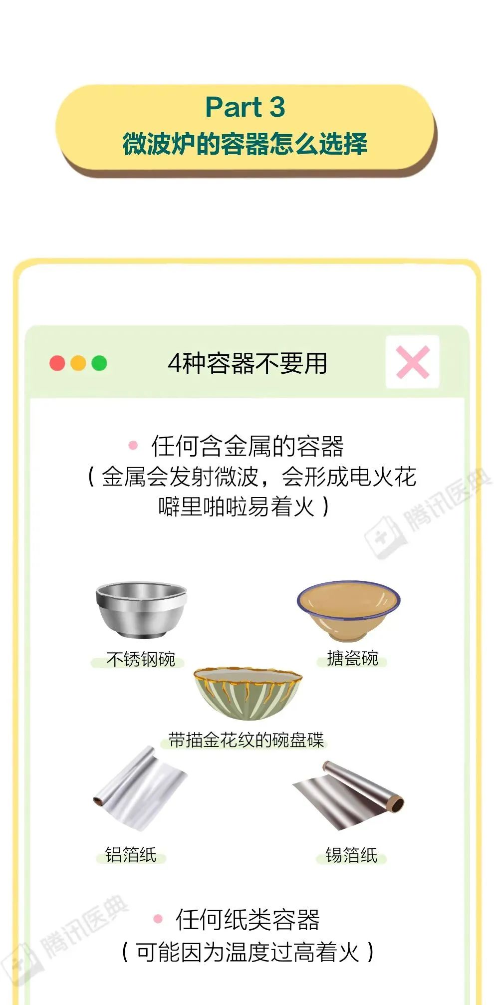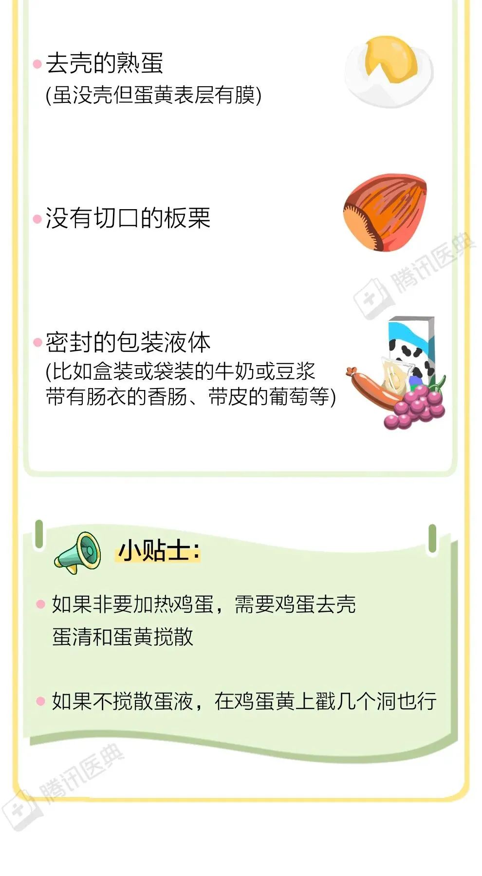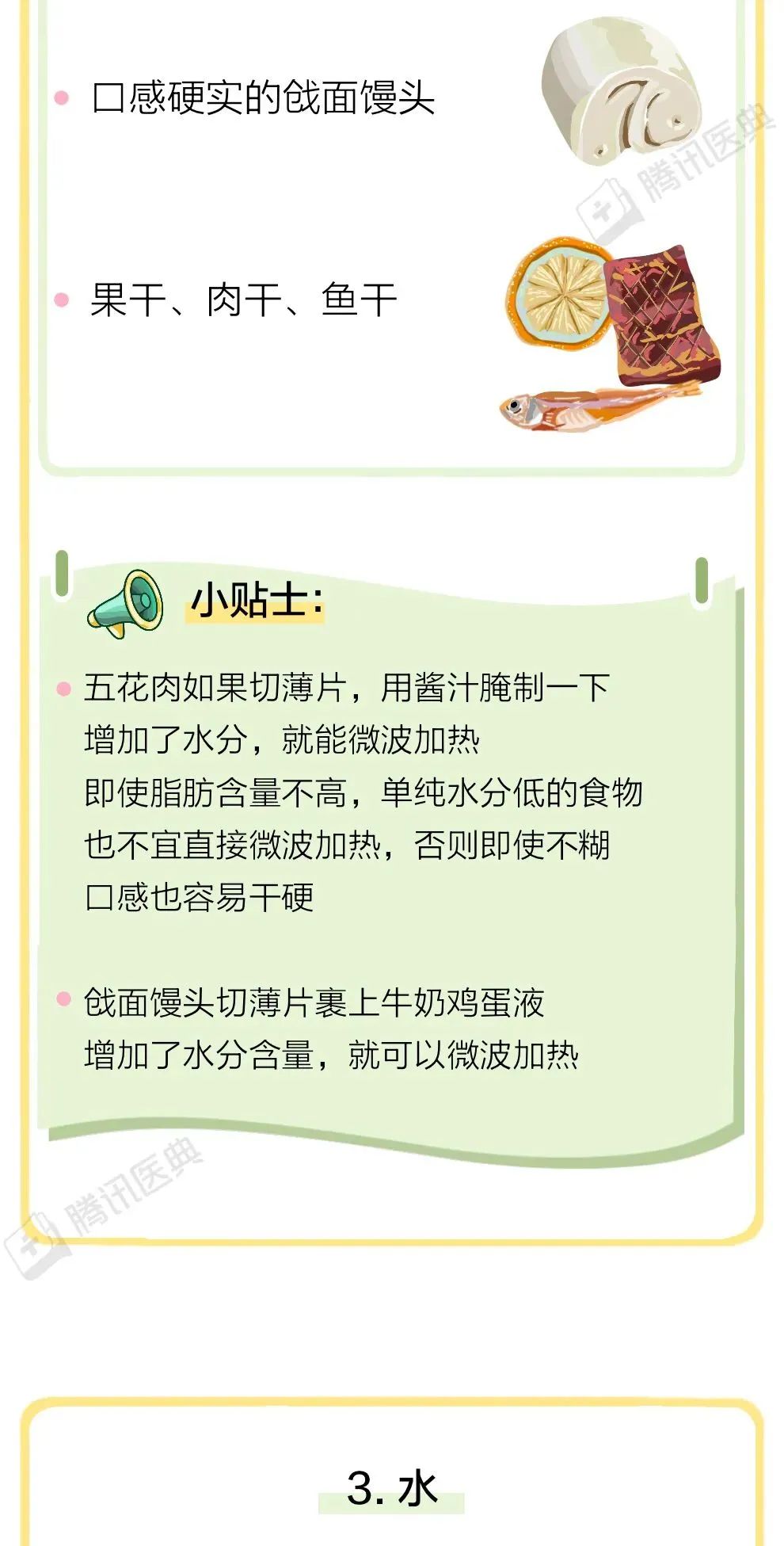 首页 > 生活 这 3 种食物,不要放进微波炉!第 1 个就大意了 原创 腾讯医典 腾讯医典最后划重点,7类东西不要放进微波炉: 1.有膜或有外壳的食物 2. 水分低的食物 3. 水 4. 含含金属的容器 5. 纸类容器 6. 微波专用之外的塑料容器 7. 任何不耐高温的玻璃容器 审核专家:谷传玲 注册营养师 参考文献*腾讯医典内容团队出品 相关阅读 原标题:《这 3 种食物,不要放进微波炉!第 1 个就大意了》 阅读原文