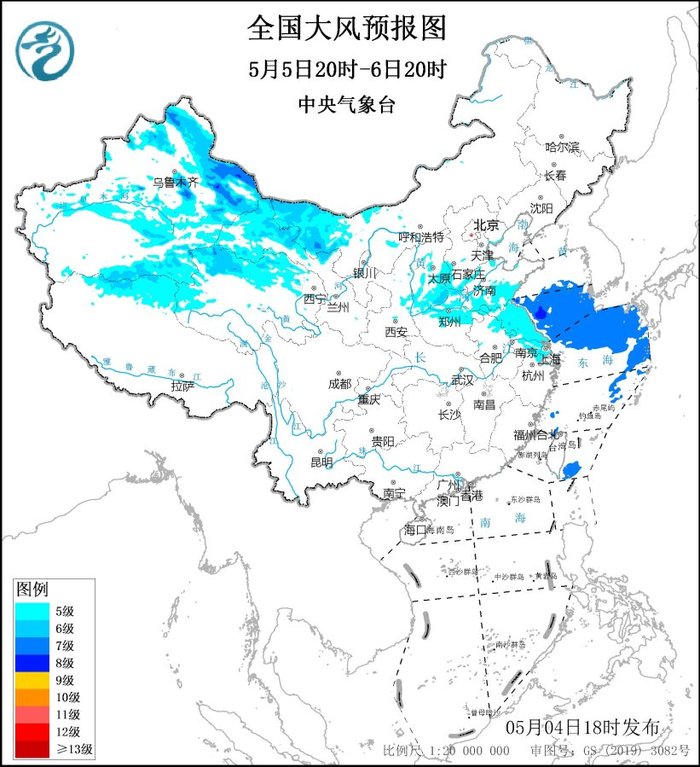5月5日20时至6日20时,新疆北部和东部、青海北部、西藏北部、内蒙古西部、陕西北部、山西中南部、河北南部、河南北部、山东西部、江苏北部等地有5~7级风,阵风8~10级,黄海南部海域、东海东北部海域将有7~8级风、阵风9~10级。