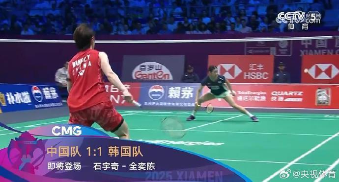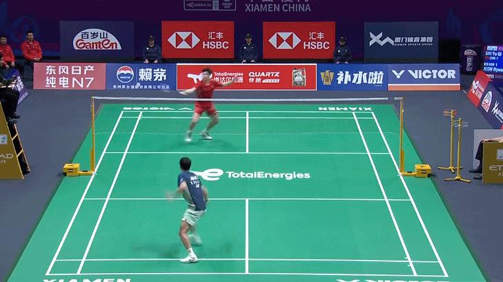 第三场男单比赛中,石宇奇只让对手得了 10 分,2-0 轻取全奕陈,中国队 2-1 领先韩国队。