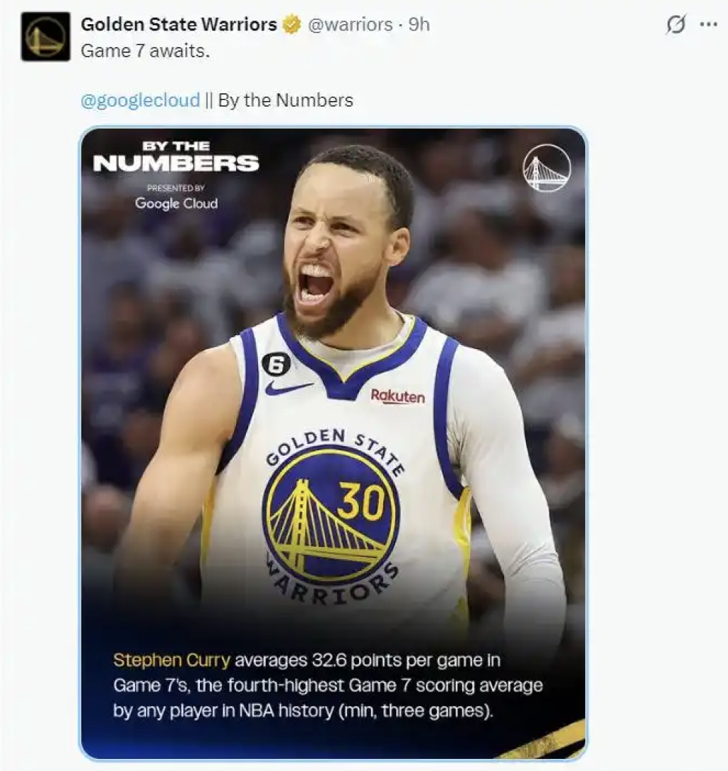 就在这样的情况下,勇士官方在赛前晒出了一项数据:斯蒂芬·库里职业生涯抢七大战场均32.6分在NBA历史排名第3位(最少5场),仅次于杜兰特的36.2分和詹姆斯34.9分,而且2023年对阵国王的抢七大战,彼时的库里在客场狂轰50分,最终带走胜利。