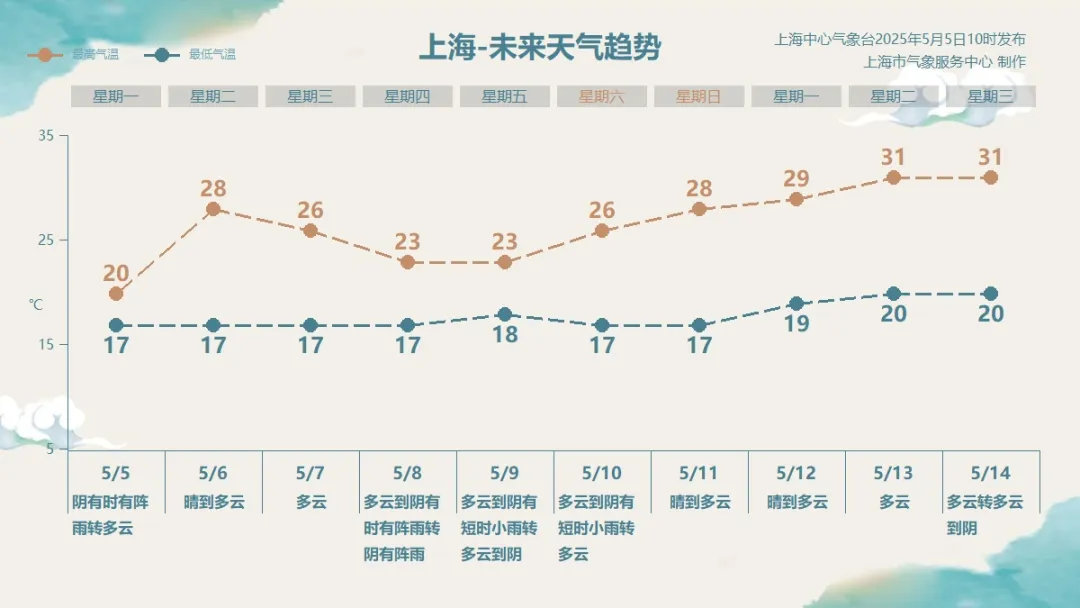 五一小长假后的首个工作日,上海是晴到多云的天气,气温迅速回升,预计最高气温可达28℃,和今日阴凉的体感大不同。7日延续多云的天气,最高气温稍有回落,在26℃左右。8-9日受新一股冷空气影响,上海又将会出现一次比较明显的降水过程。风雨影响下,最高气温将会再次回落至23℃附近。下个双休日,申城天气恢复平静,以多云为主,最高气温再次上升。