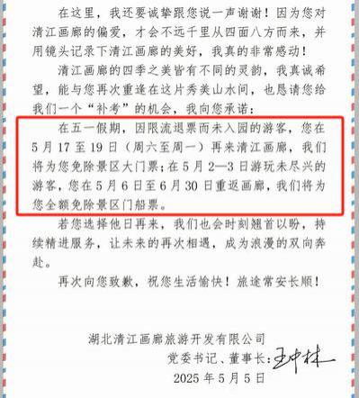 5 月 5 日,一封以湖北清江画廊旅游开发有限公司党委书记、董事长王中林的名义发布的公开信在网上流传:在五一假期,因限流退票而未入园的游客,您在 5 月 17 至 19 日(周六至周一)再来清江画廊,我们将为您免除景区大门票;在 5 月 2-3 日游玩未尽兴的游客,您在 5 月 6 日至 6 月 30 日重返画廊,我们将为您全额免除景区门船票。