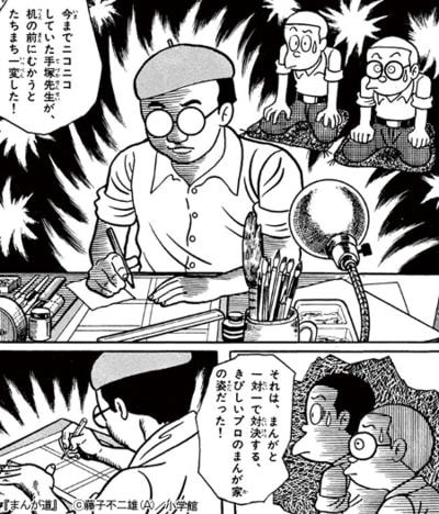 只不过,20世纪昭和年间绘成的《漫画道》和21世纪令和年间绘成的《蓦然回首》之间存在着决定性的区别。在前者的故事中,包括满贺和才野在内,故事中所有新人漫画家都十分尊敬被誉为漫画之神的手冢治虫,这种憧憬甚至在作品中以手冢身上反复散发着光芒的形式实现了神格化。此外,除了聚集在常盘庄结成“新漫画党”,追求全新儿童漫画的满贺和才野之外,故事中登场的,在日后引领战后日本漫画史的寺田博雄、石森章太郎、赤冢不二夫、角田次朗等巨匠们,都是为了漫画这个理想而赌上了自己的青春。