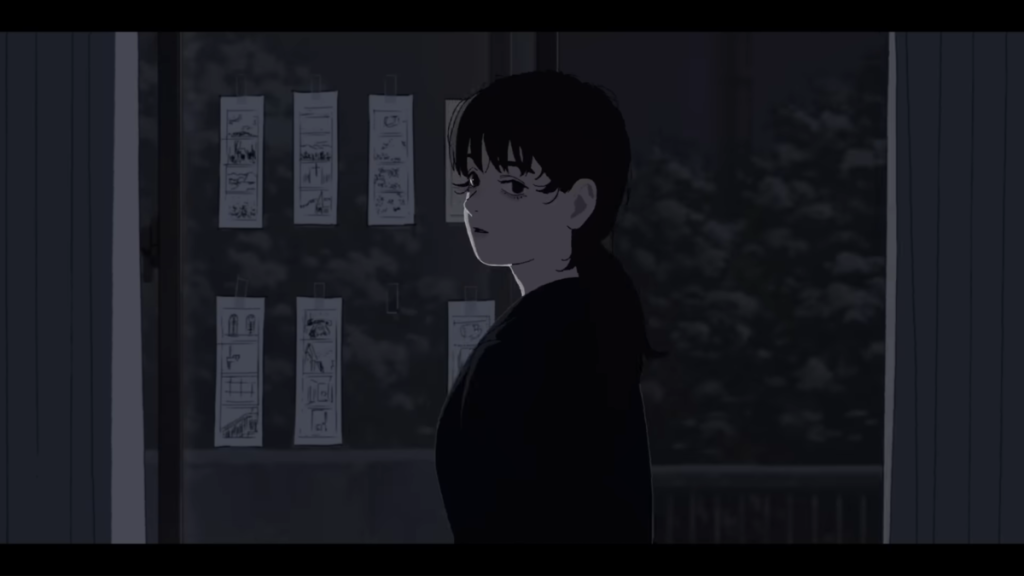 例如,故事开始,在镜头聚焦在面向桌子聚精会神地画画的藤野之后,画面突然被她笔下的四格漫画所占据,并像动画一样动了起来。对于这个场景,押山导演还专门旁注道:“期待画手的情感会被原原本本地投射在画面上”。对描线的刻意保留不仅是对于“原动画”手法的实践,更给整部作品作画带来充满情感的独特“手绘风”。